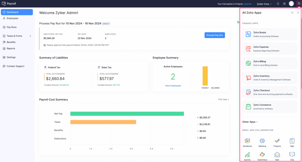 Zoho Payroll simplifies salary processing and payroll management by automating employee payments, deductions, payslips, and compliance requirements.